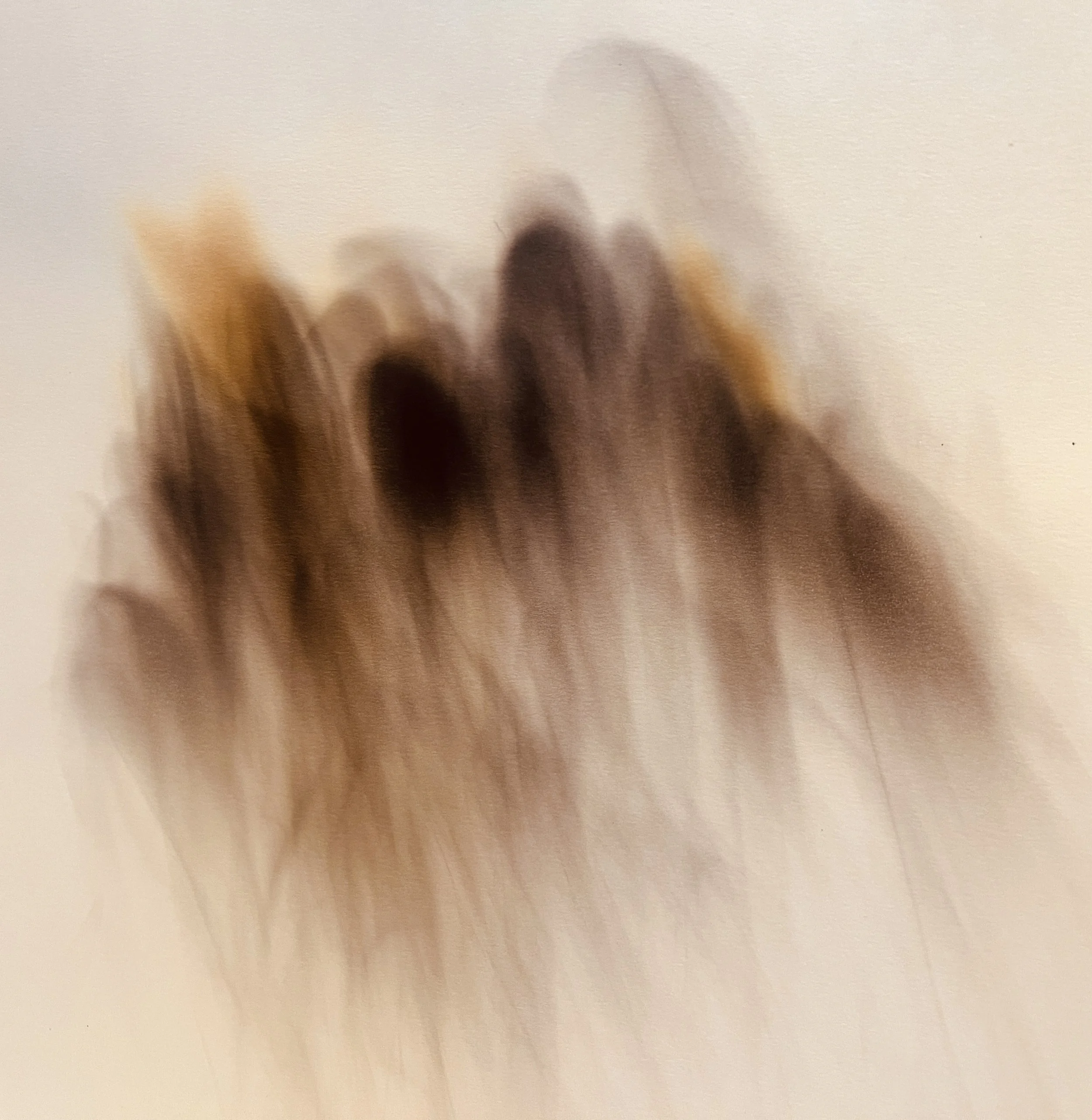 Fumage (from the French word for "smoke") is a spontaneous creative process where you hold paper over a candle flame, allowing the smoke to leave organic, unpredictable traces of soot on the surface. These smoky marks create their own mysterious landscape—sometimes appearing as figures, sometimes as abstract forms, always with an otherworldly, dreamlike quality.